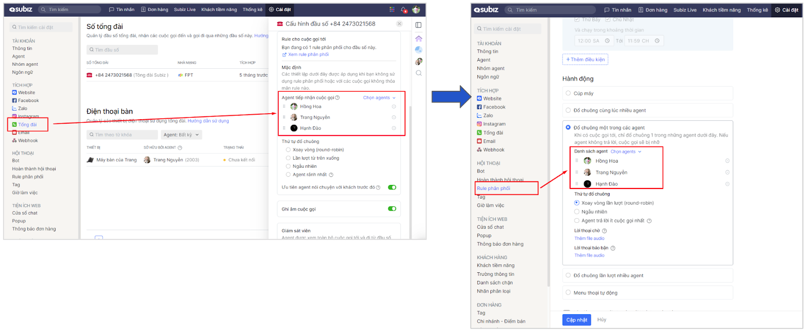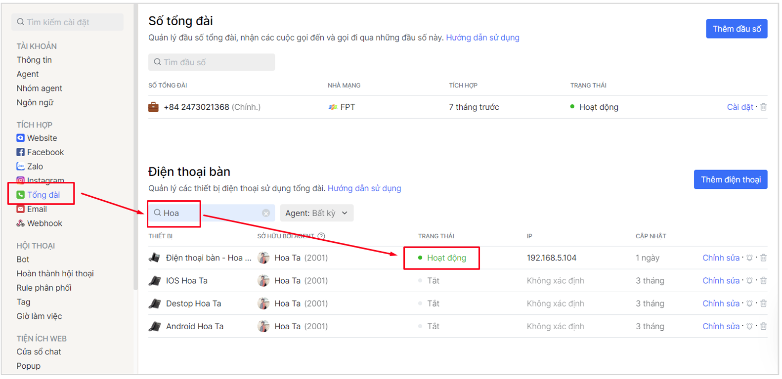 - Bước 1: Mở cài đặt số tổng đài rồi kiểm tra danh sách các agent tiếp nhận cuộc gọi => Thêm agent nếu chưa có
