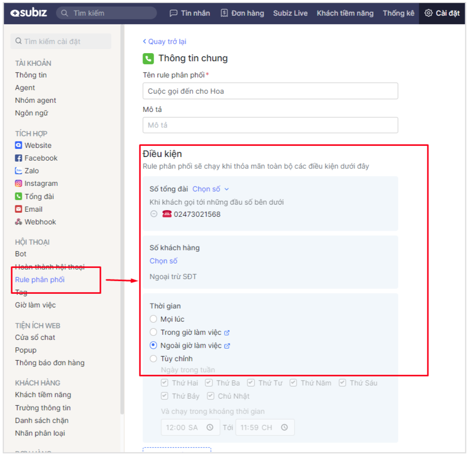 - Bước 2: Mở cài đặt rule phân phối cuộc goi đến và kiểm tra danh sách agent được đổ chuông cuộc gọi đến => Thêm agent nếu chưa có