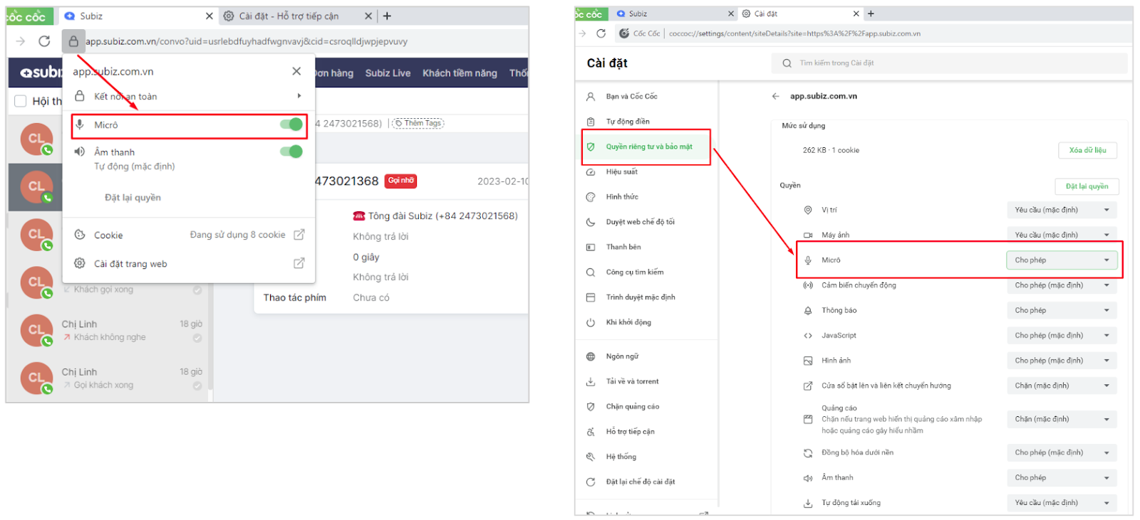 => Click nút Khóa bên phải đường link https://app.subiz.com.vn, chọn Micro và bật ON cho phép. Hoặc mở cài đặt Quyền riêng tư và bảo mật > chọn Micro và bật ON cho phép
