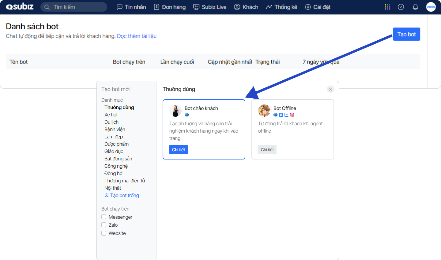 Chọn Tạo bot, nhấp sử dụng Bot Chào khách