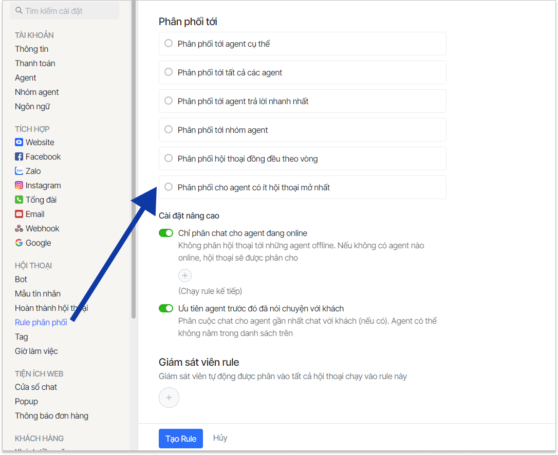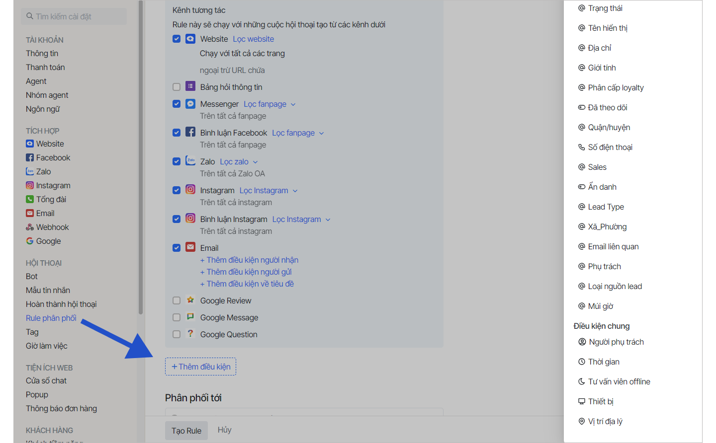 Nếu bạn muốn chia khách cho các tư vấn viên khác nhau, bạn sẽ cài đặtRule phân phối. Chức năng Rule phân phốicho phép bạn tự động chia hội thoại đến đúng tư vấn viên dựa trên tiêu chí như: