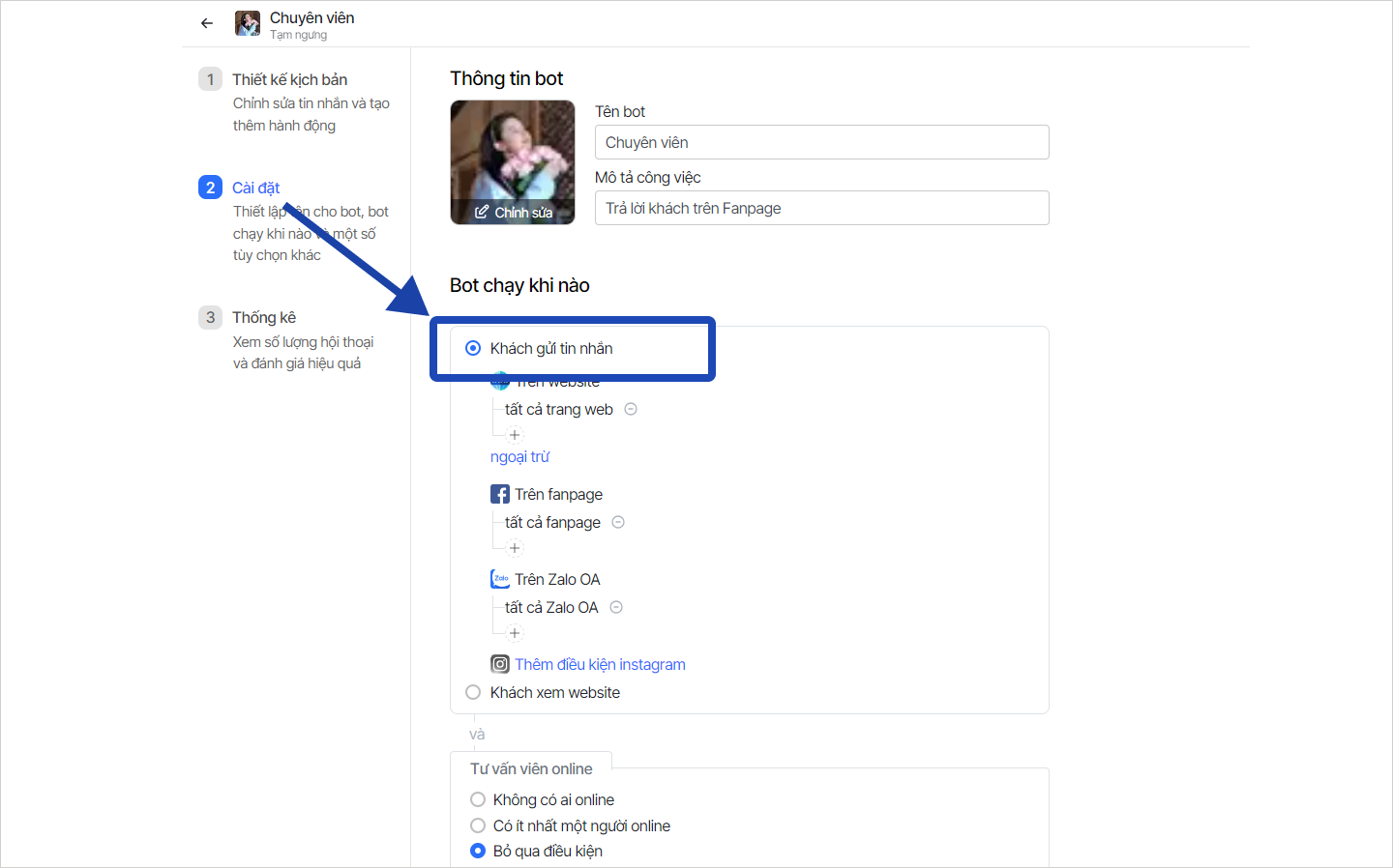 Tại mục 2 Cài đặt, chọn Bot chạy khi “Khách gửi nhắn tin”