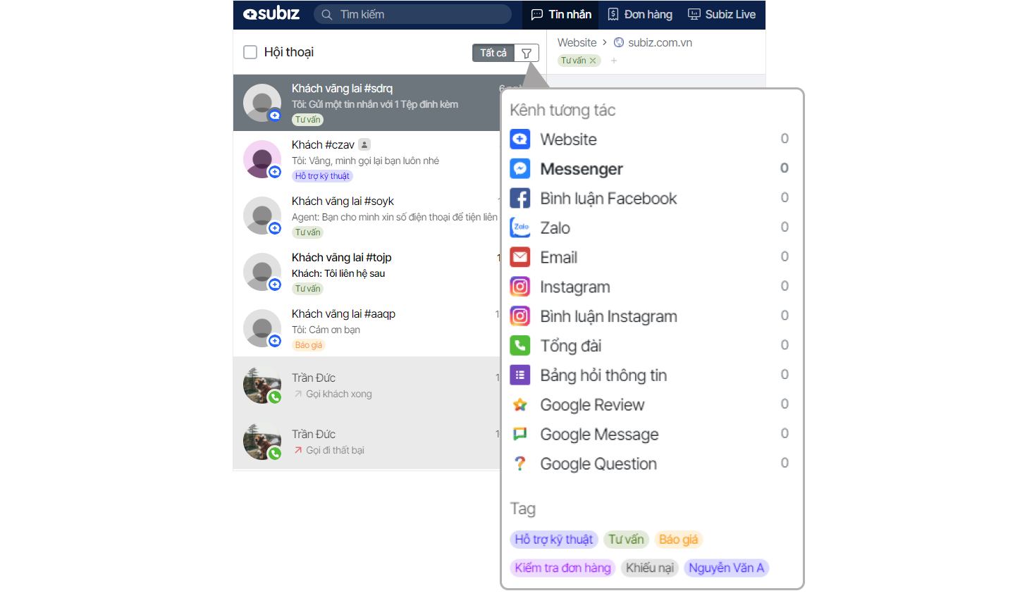 Bạn lọc tìm nhanh được khách theo nhiều tiêu chí bằng cách click nút “Lọc” ngay trên trang Tin nhắn, nút “Lọc” hiện trên cùng cột Hội thoại.