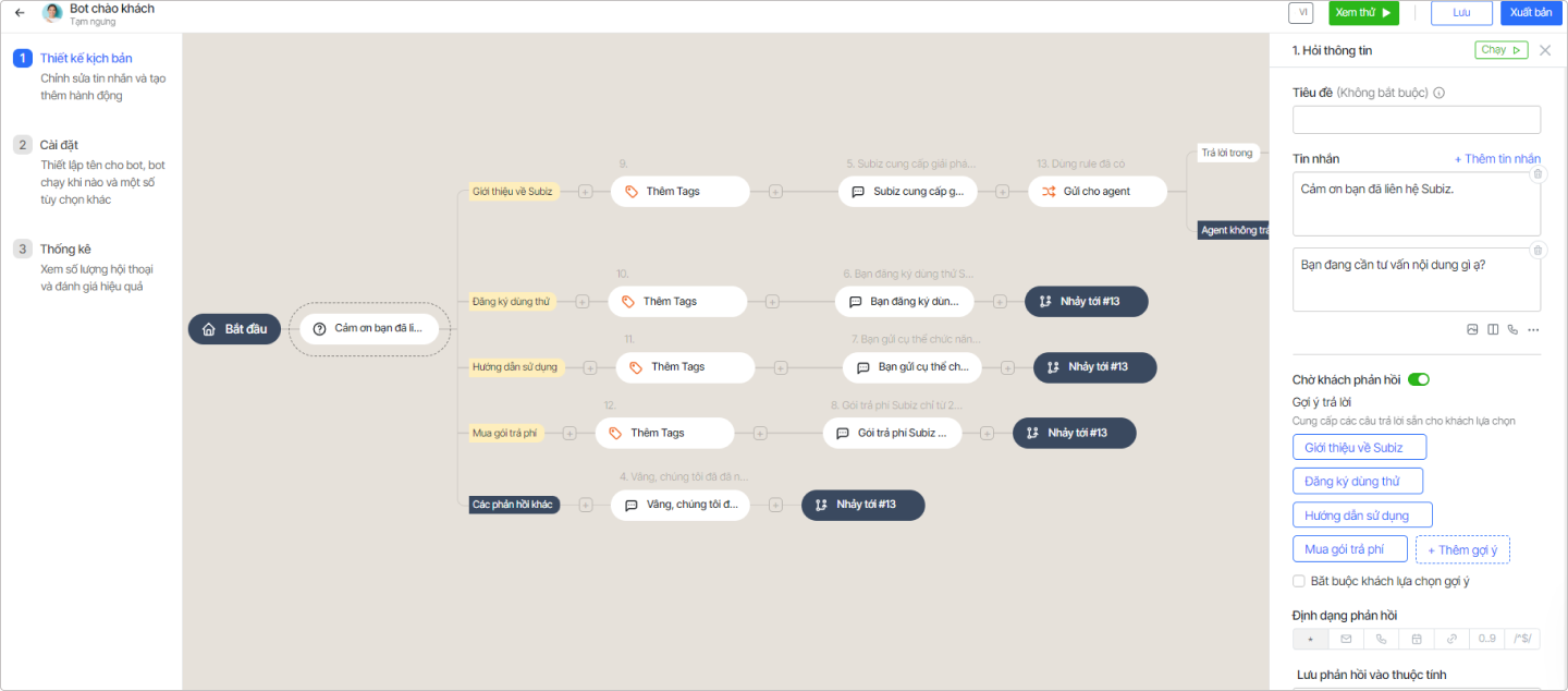 Bot Subiz hoạt động theo kịch bản thiết kế sẵn, giúp tự động hóa toàn bộ quy trình chăm sóc khách hàng. Các chức năng chính của bot: