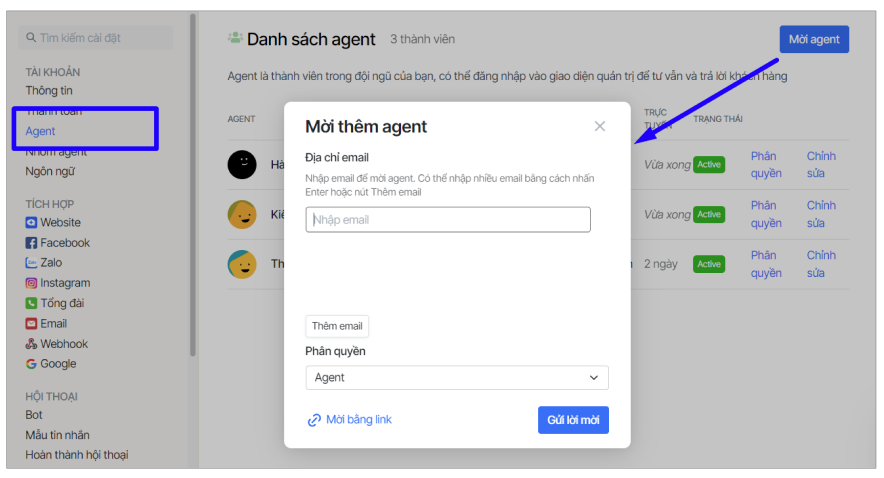 Khi bạn muốn thêm tư vấn viên vào Subiz làm việc và trả lời khách hàng, bạn cần mời agent tại trangCài đặt agentnày.