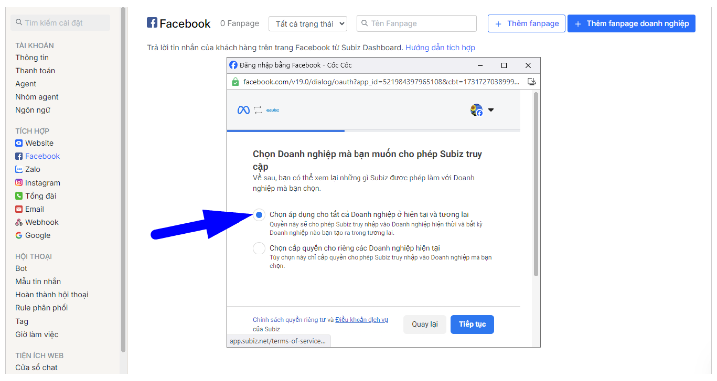 Sau đó Subiz sẽ hiển thị danh sách Fanpage để bạn chọn thêm vào Subiz