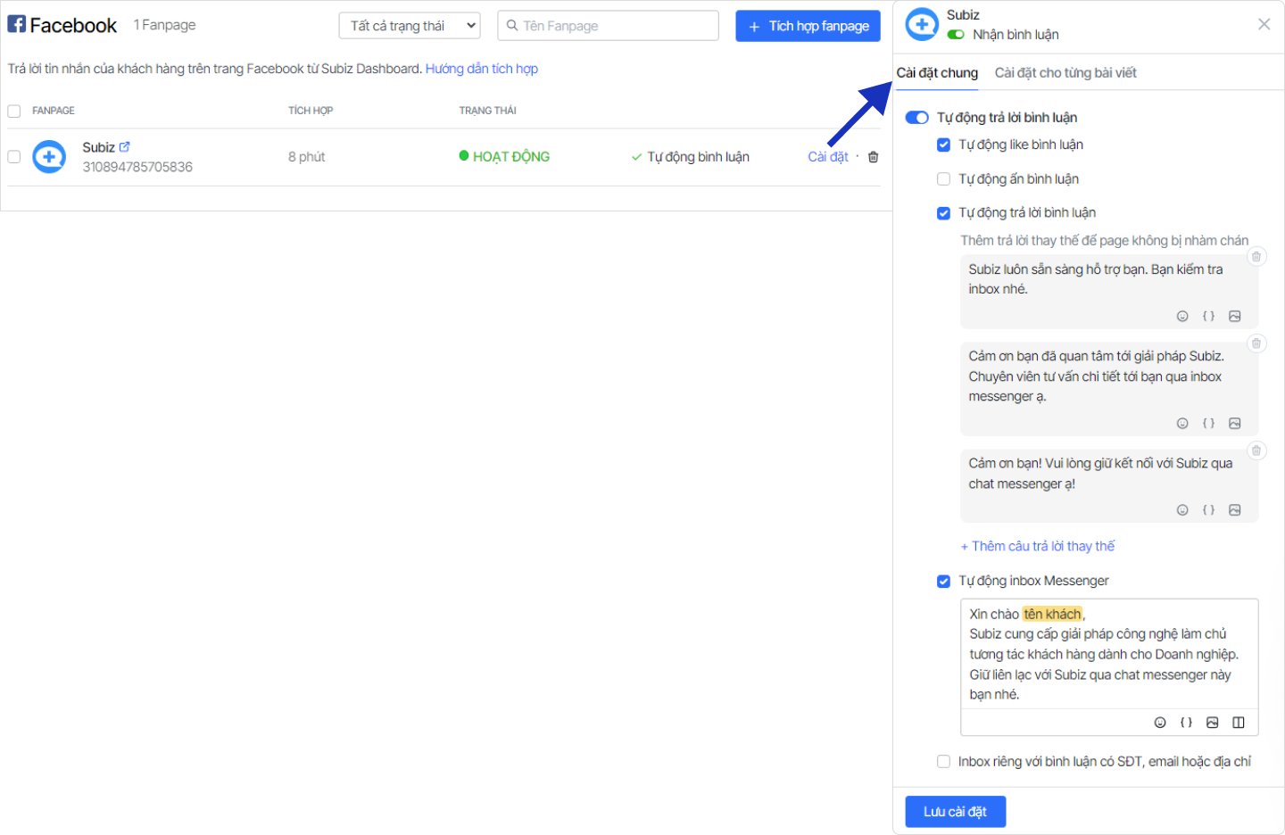 Tự động hóa: Trả lời bình luận, like, ẩn bình luận và gửi tin nhắn Messenger tự động.