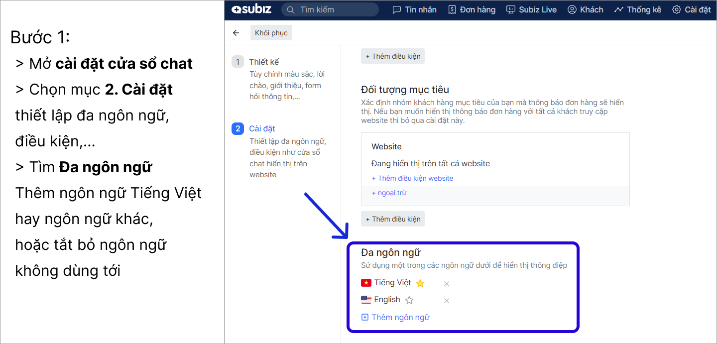 - Tại mục 2. Cài đặt, tìm Đa ngôn ngữ và thêm ngôn ngữ hiển thị trên cửa sổ chat