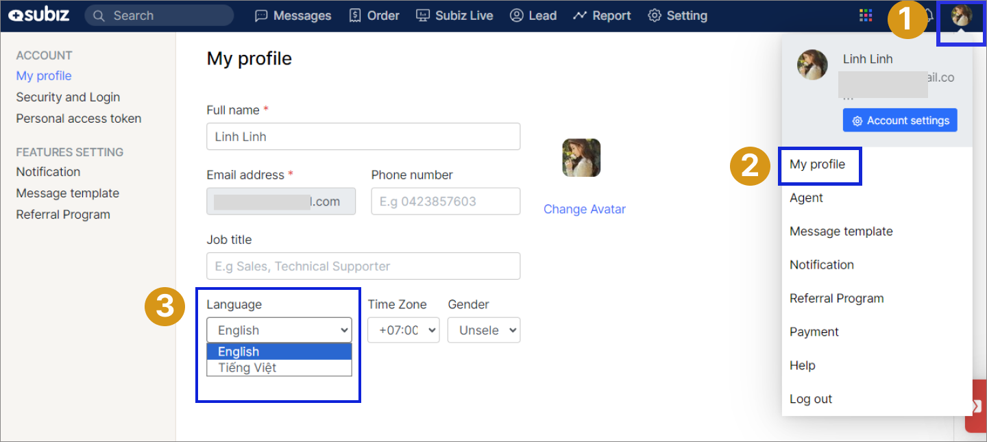 Agent có thể thay đổi ngôn ngữ trang làm việc app.subiz.com.vn là tiếng Việt hoặc English tại trang Hồ sơ và tùy biên / My profile như sau: