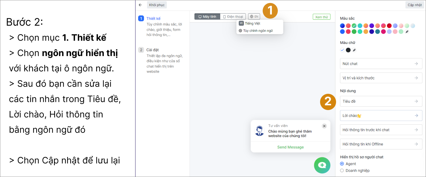 - Chuyển sang mục 1. Thiết kế, chọn ngôn ngữ hiển thị trên cửa sổ chat và sửa các nội dung theo ngôn ngữ đó