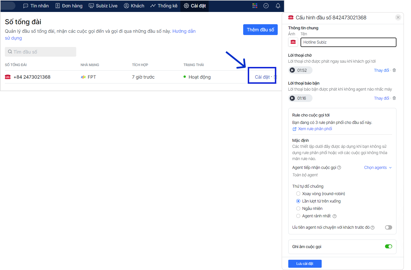 Khi bạn đã có đầu số tổng đài, bạn sẽ thêm đầu số này vào phần mềm Subiz với 4 bước sau: