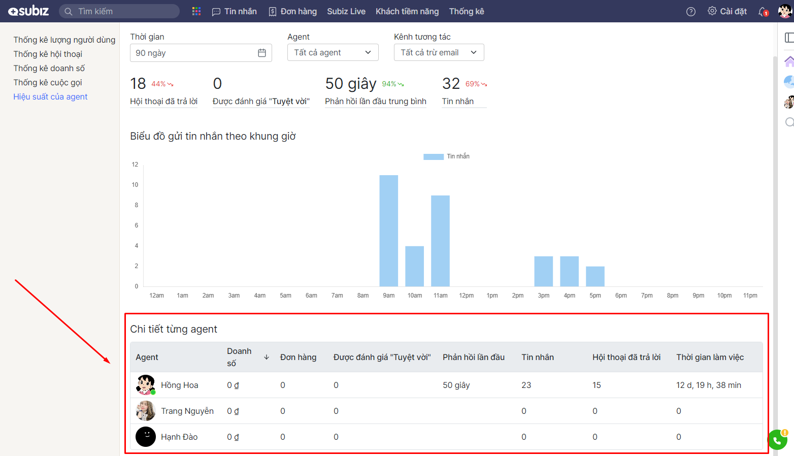 Trang Thống kê hiệu suất agent tổng hợp báo cáo tất cả dữ liệu trên giúp bạn đánh giá được tình hình làm việc và hiệu quả tư vấn khách hàng của mỗi agent.