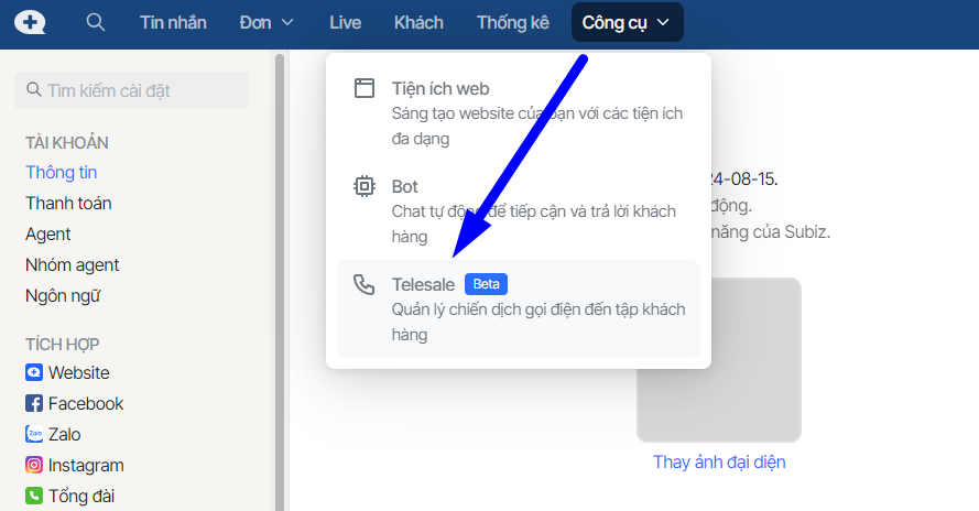 . Trên thanh công cụ, chọn mở Công cụ và nhấp chọn Telesales
