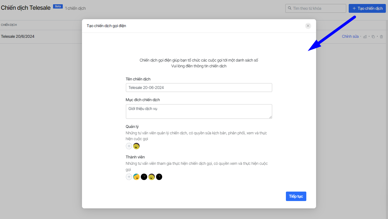 - Bước 2: Tạo chiến dịch mới. Rồi nhập các thông tin tên chiến dịch, người quản lý và các agent thành viên