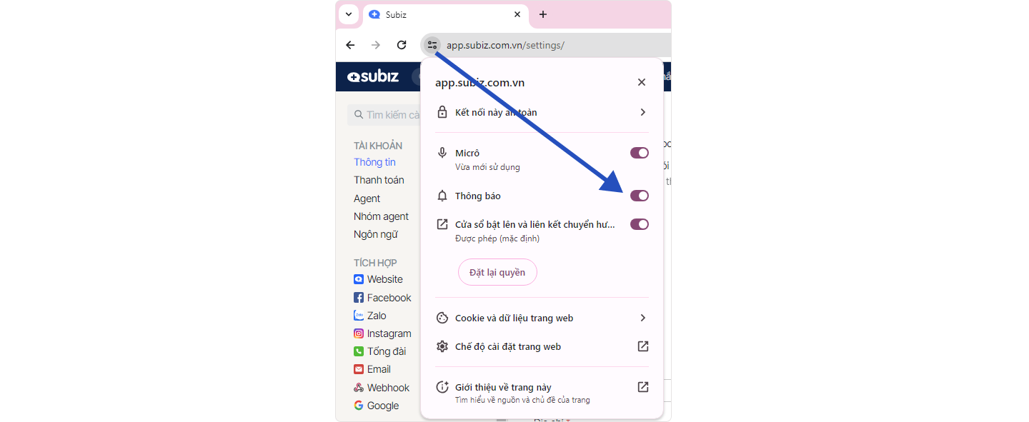 Ví dụ bạn kiểm tra cài đặt trình duyệt bằng cách click nút cài đặt bên trái đường link App.subiz.com.vn và bật ON các quyền “Thông báo”.