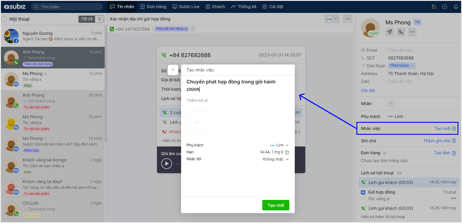Bạn có nhiều cuộc gọi liên tục và cần ghi nhớ một số công việc hỗ trợ khách hàng sau đó, bạn tạo nhắc việc cần làm như sau: Xem thông tin khách > Click nút Tạo mới - Nhắc việc