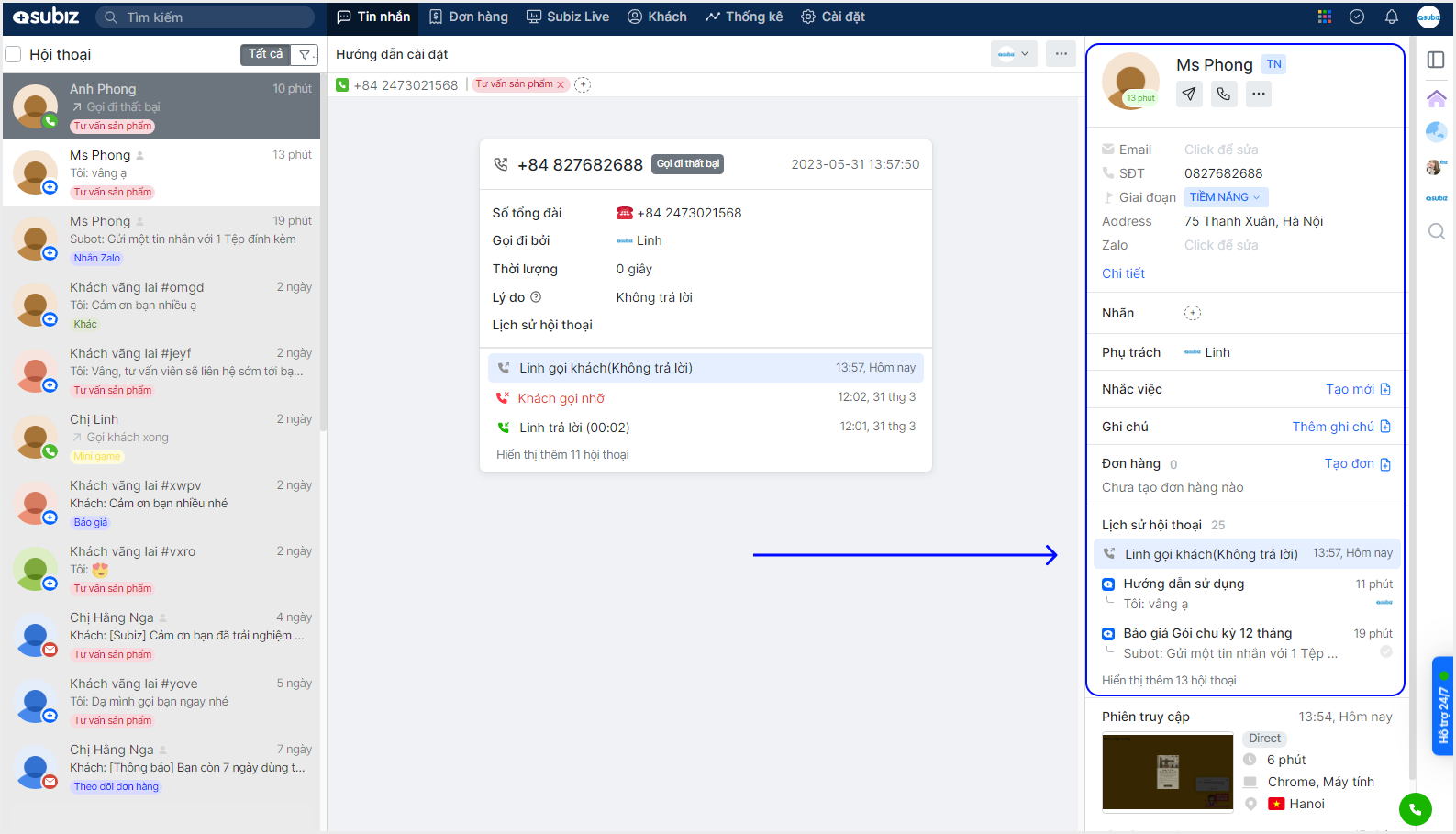 Khi khách hàng đã có SĐT lưu trên Subiz, agent sẽ gọi điện thoại cho khách bằng cách nhấp nút GỌI ở ngay dưới họ tên khách.