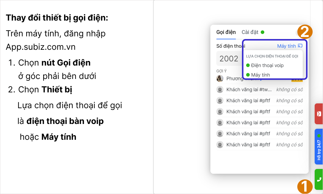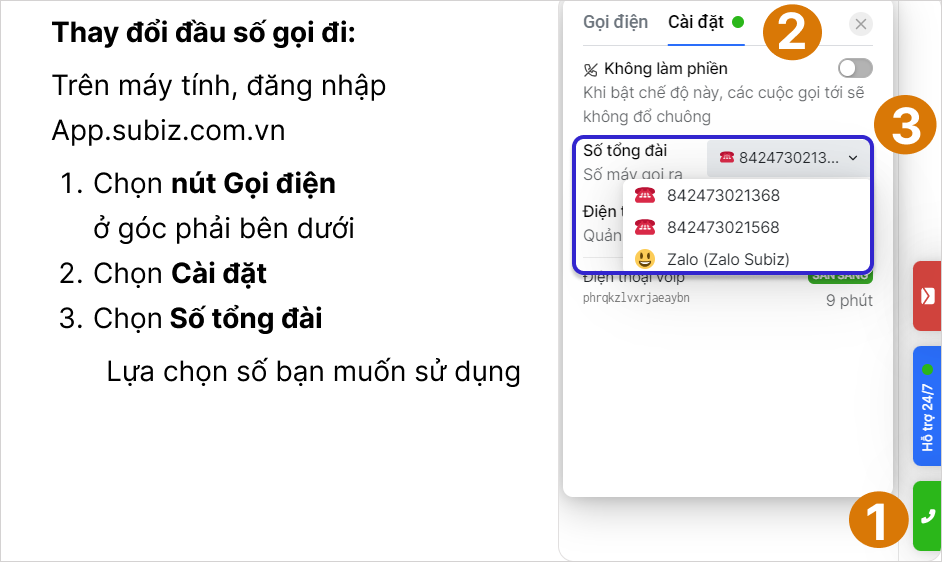 Hướng dẫn thay đổi thiết bị gọi điện thoại trên Subiz như sau: