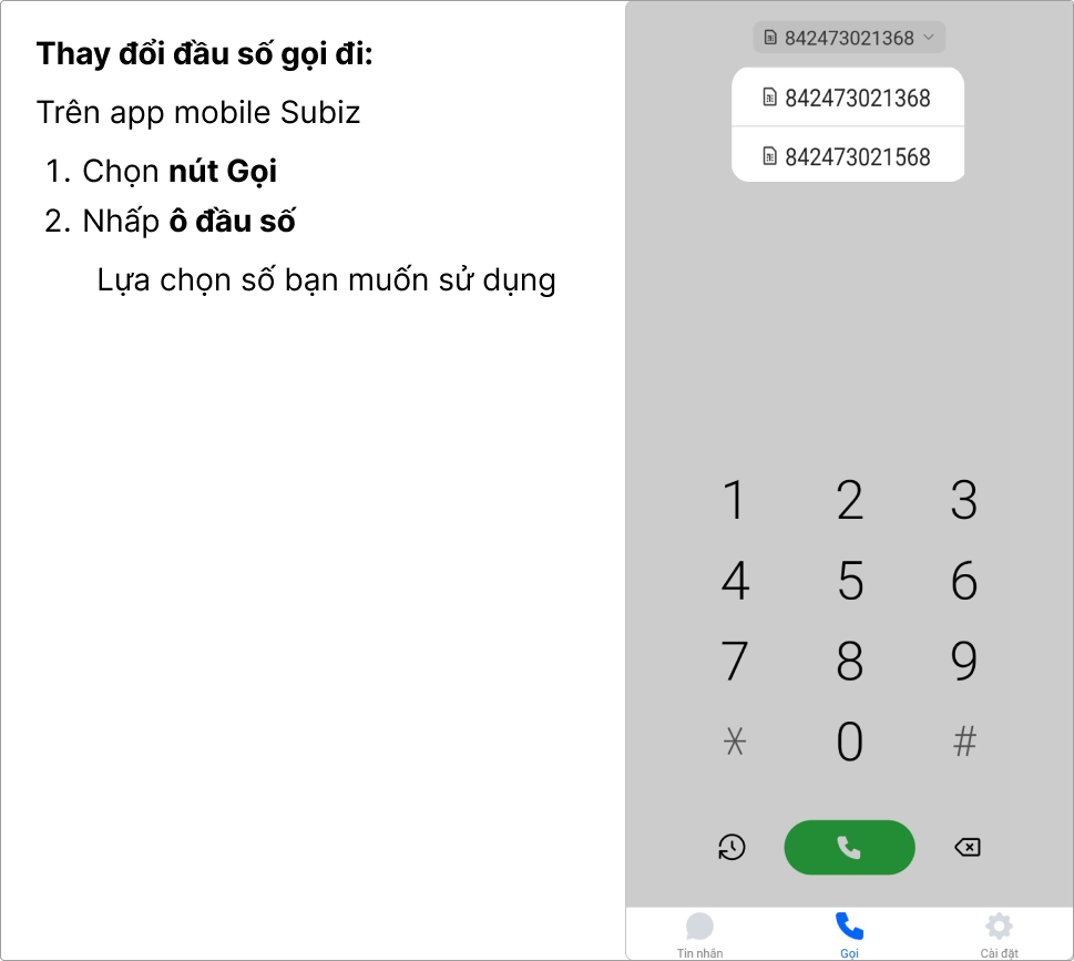 Trên điện thoại smartphone, agent tải app Subiz về và bấm số gọi đi như sau: