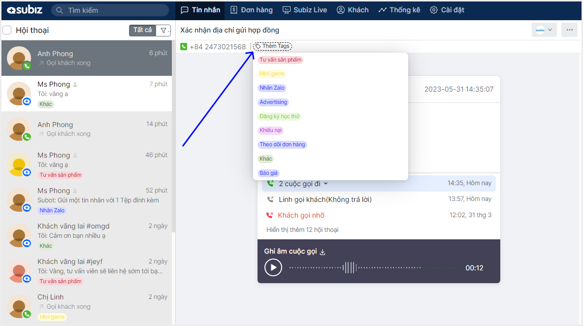 Tư vấn khách hàng qua điện thoại có thể về nhiều chủ đề khác nhau như Tư vấn sản phẩm, báo giá, kiểm tra đơn hàng,... Bạn sử dụng chức năng gắn Tag cuộc gọi để đánh dấu chủ đề của cuộc gọi và báo cáo tình hình hỗ trợ khách hàng.