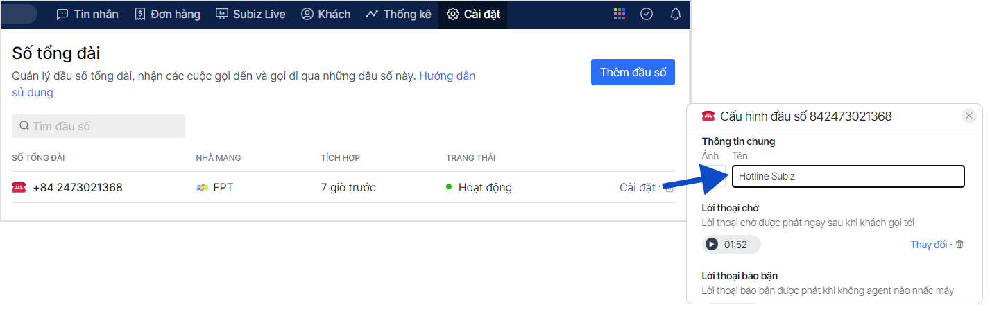 - Bước 1: Mở trang cài đặt tổng đài > Tại mục Số tổng đài, chọn nút Cài đặt ở bên phải của đầu số và đặt tên cho đầu số này
