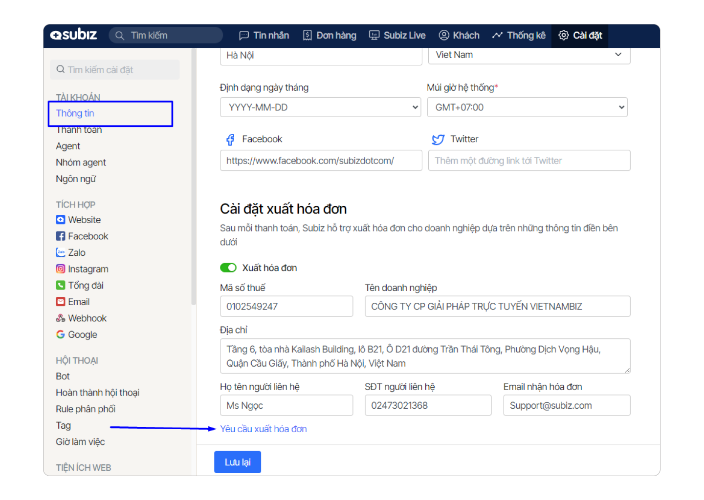 Bạn gửi yêu cầu xuất hóa đơn VAT và nhập chính xác thông tin của Doanh nghiệp tại trang Cài đặt thông tin này.