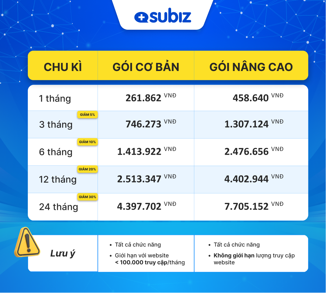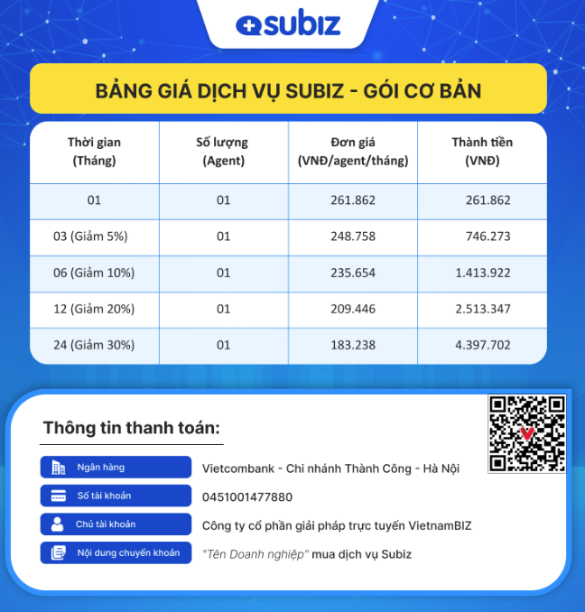 Lưu ý:+ Dịch vụ Subiz không chịu thuế VAT+ Hóa đơn VAT chỉ được xuất trong 30 ngày kể từ khi Subiz nhận được thanh toán.