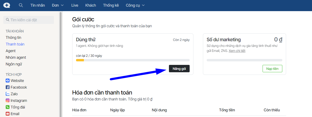 Bạn được chủ động mua dịch vụ Subiz ngay trên tài khoản Subiz của bạn bằng cách mở trang Thanh toán.