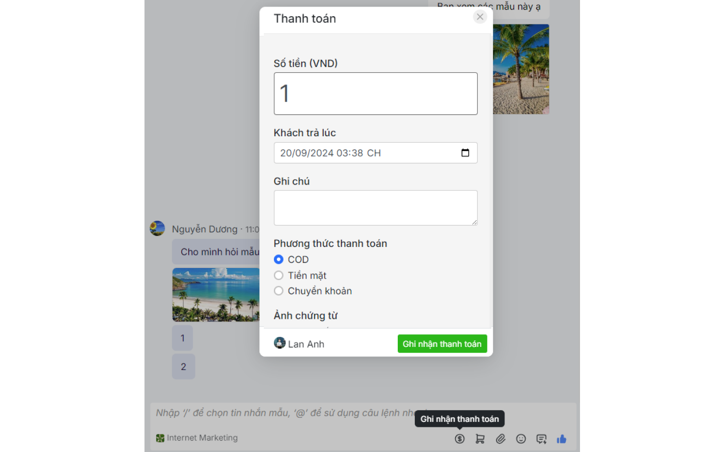 Khi khách nhắn tin đến từ quảng cáo Facebook và đạt mục tiêu chuyển đổi, bạn bấm nút Ghi nhận thanh toán để nhập thông tin vào bảng.