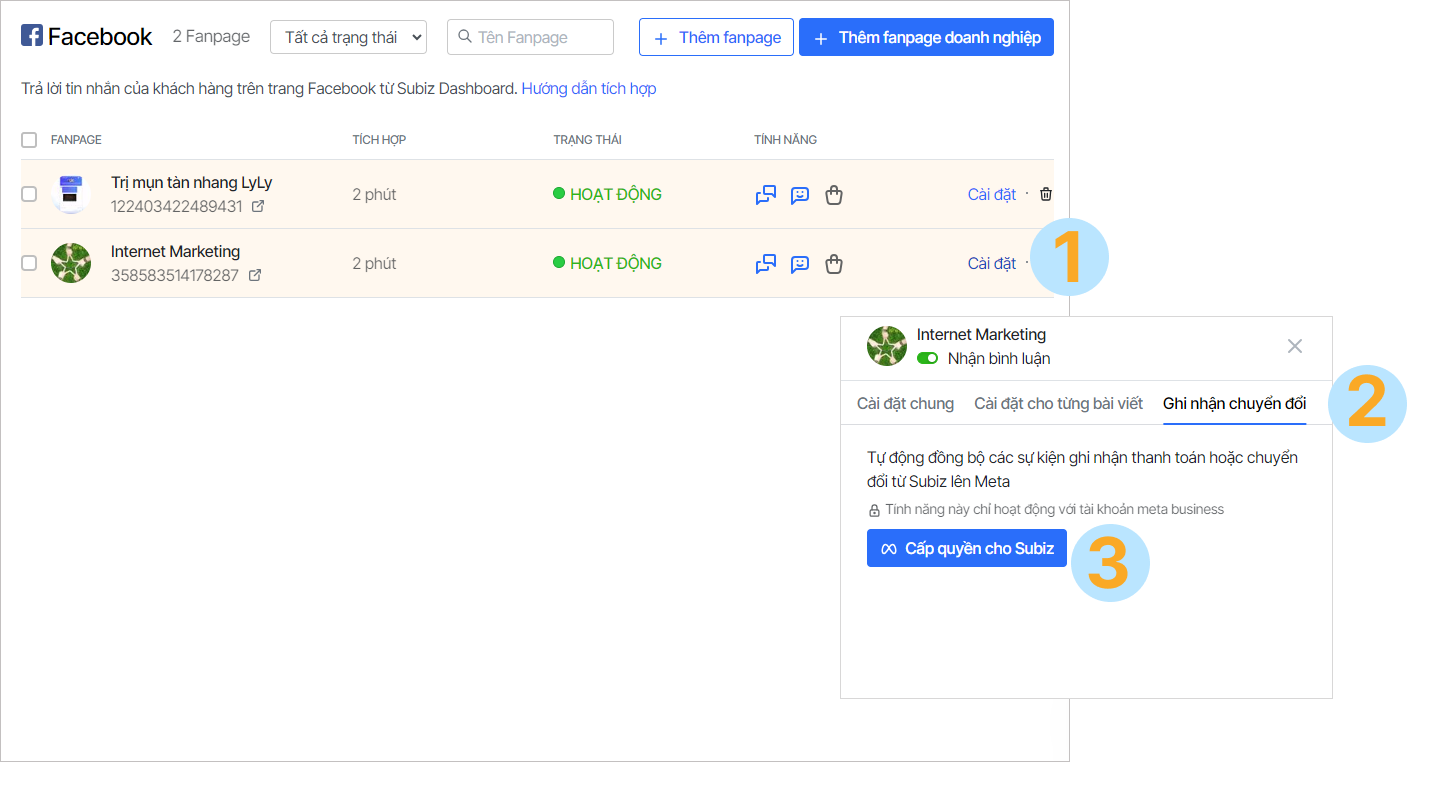 Để cho phép Subiz đồng bộ các sự kiện chuyển đổi từ Subiz lên Facebook ads, bạn làm 2 bước: