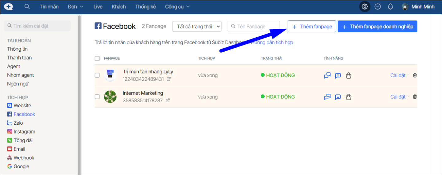Bước 1: Thêm Fanpage vào Subiz