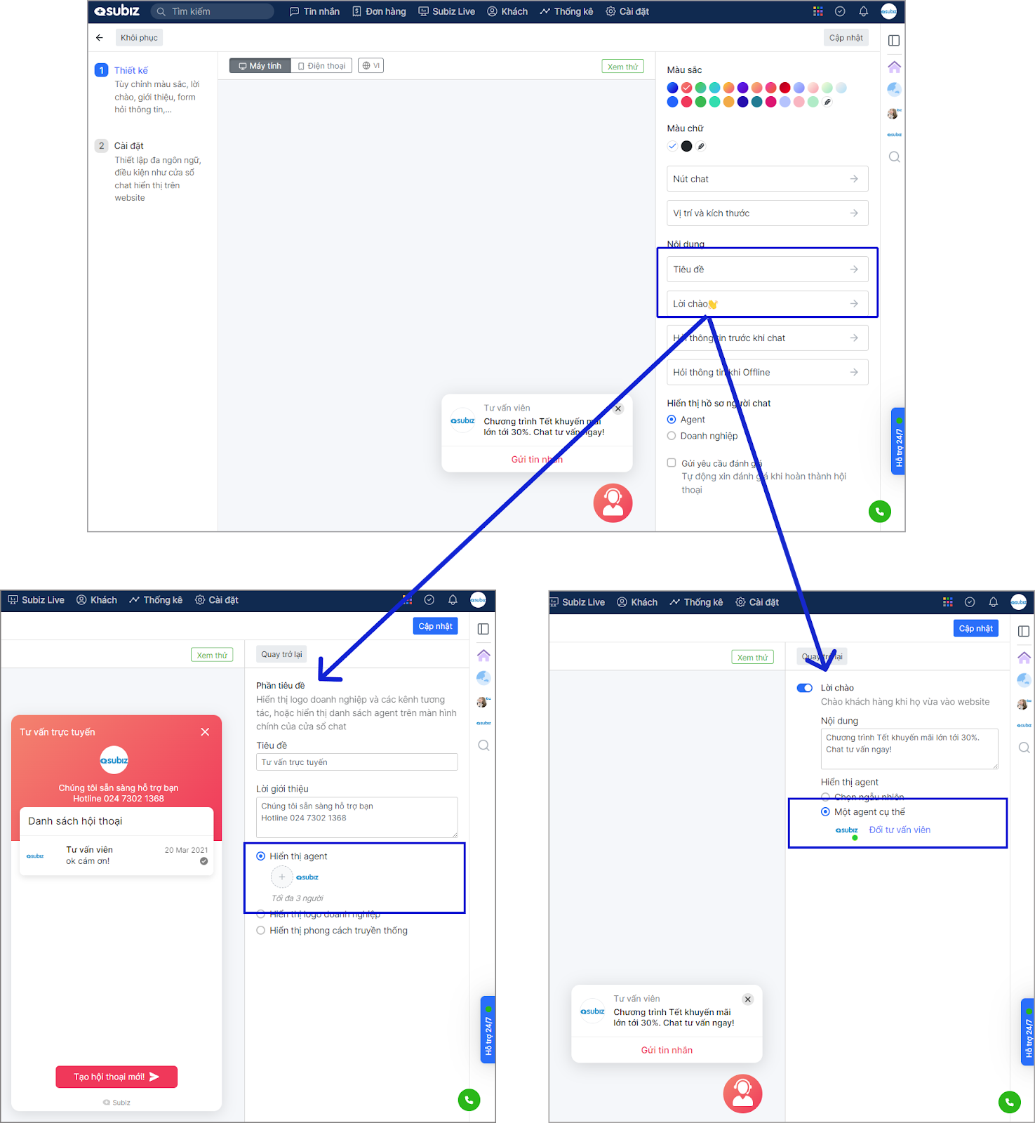 Bước 3: Chỉnh sửa cửa sổ chat trên Subiz cho website đầu tiên