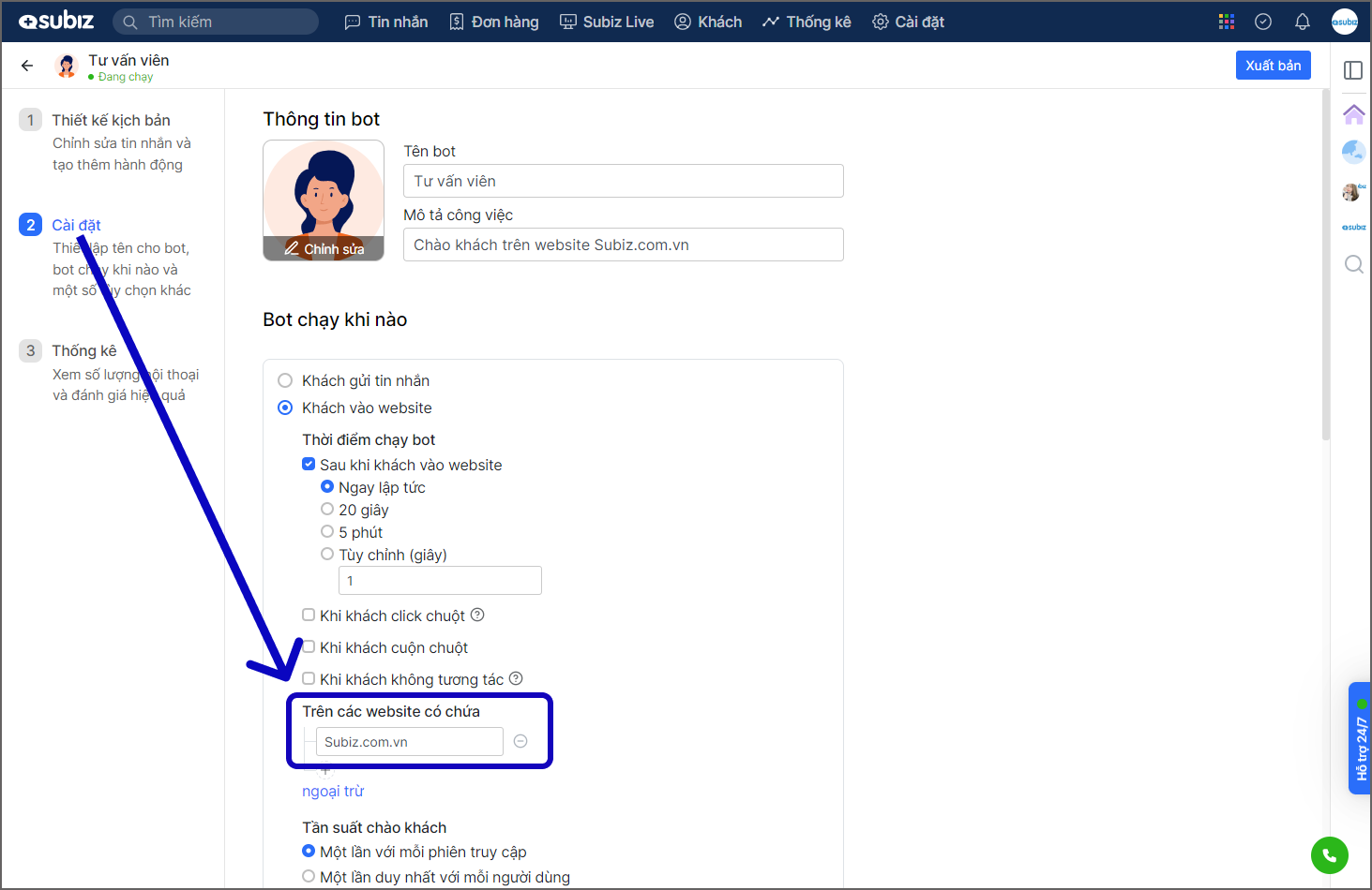 Bot tự động chào đón và trả lời riêng cho từng website. Bạn tạo bot mới và tại mục 2 cài đặt > Chọn “Trên các website có chứa” - điền “tên miền website”