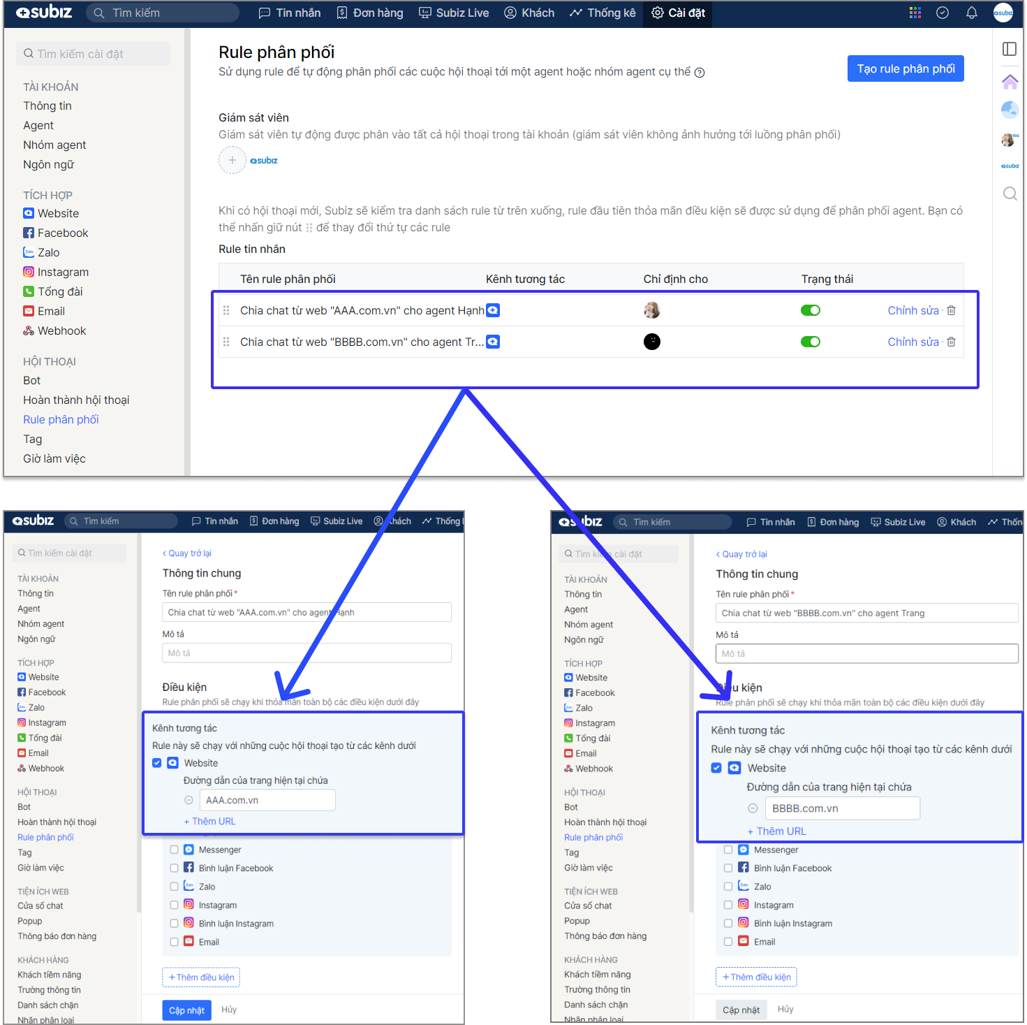 Khi bạn muốn phân chia chat từ một website cụ thể cho các agent tư vấn viên, bạn sẽ cài đặt rule phân phối: