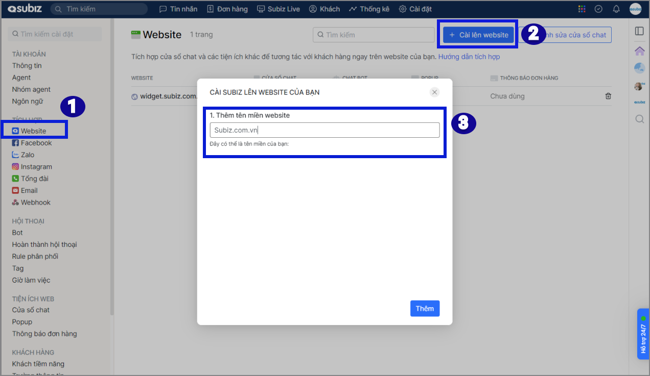 Lưu ý: Cần thêm tên miền website tại trang tích hợp website để Subiz thống kê