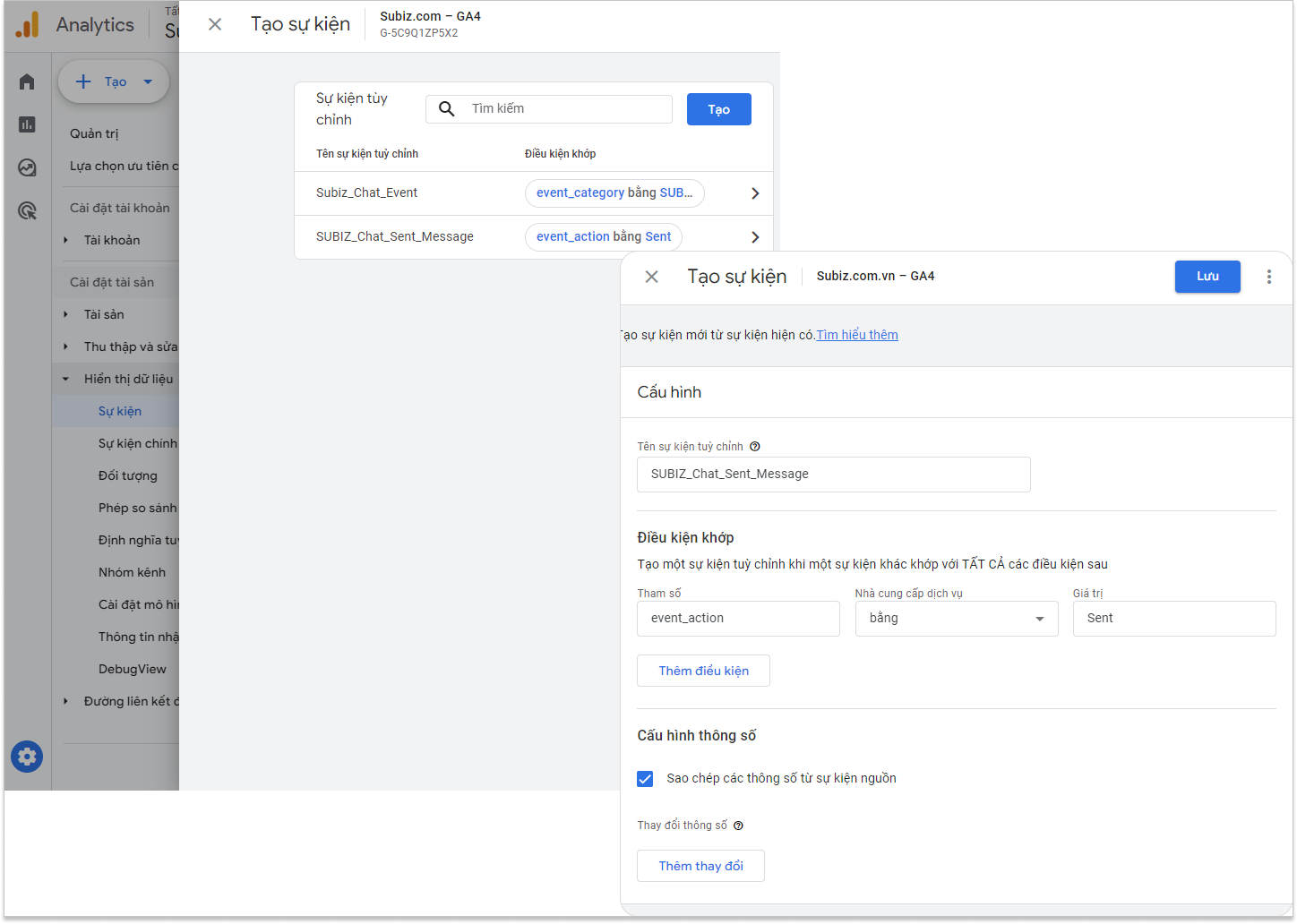 Khi bạn muốn thay đổi hiển thị sự kiện SUBIZ Chat trên GA4 theo cách riêng, bạn sẽ cài đặt trực tiếp trên GA4.