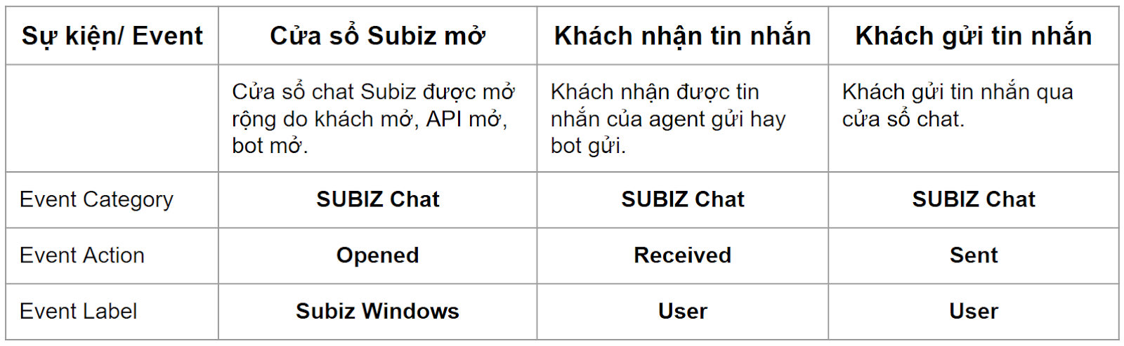 Subiz sẽ gửi các dữ liệu sự kiện (event data) của khách (user) trên website sang Google Analytics. Khi đó, bạn có thể xem được các dữ liệu này tại mục Sự kiện (event) của Google Analytics. Các sự kiện mà Subiz gửi :