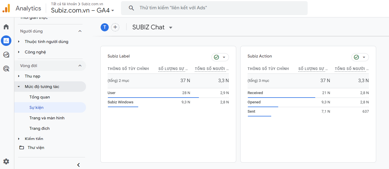 Sau khi cài đặt GTM thành công, bạn xem báo cáo sự kiện SUBIZ Chat trên GA4, ví dụ như sau: