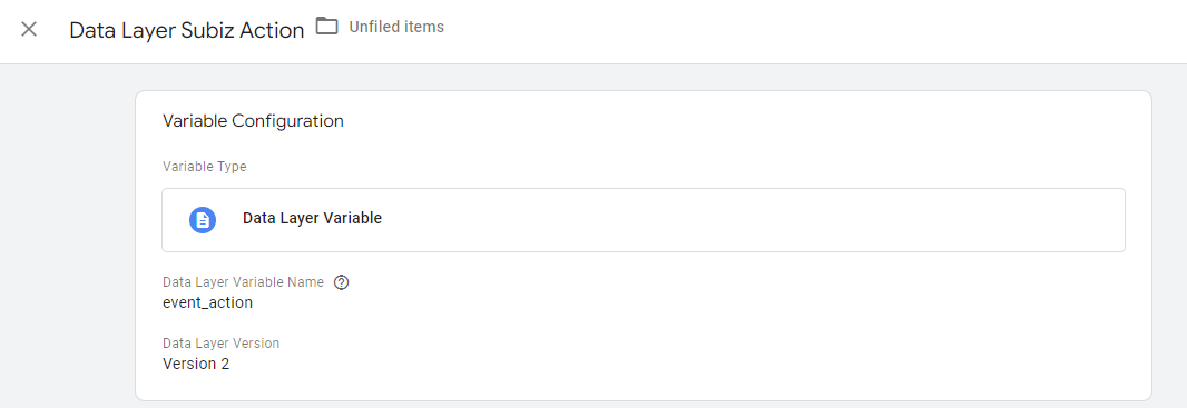 - Chọn loại Variable là “Data Layer Variable”, đặt tên cho biến Variable là Data Layer Subiz Action).