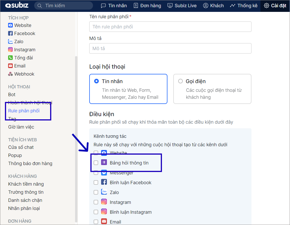 Khách điền thông tin bảng hỏi sẽ được tạo thành hội thoại nên bạn có thể phân chia agent nhân viên xem được khách bằng cách cài đặt rule phân phối hội thoại và chọn điều kiện kênh tương tác là Bảng hỏi thông tin.Xem thêm hướng dẫn sử dụng rule phân phối.