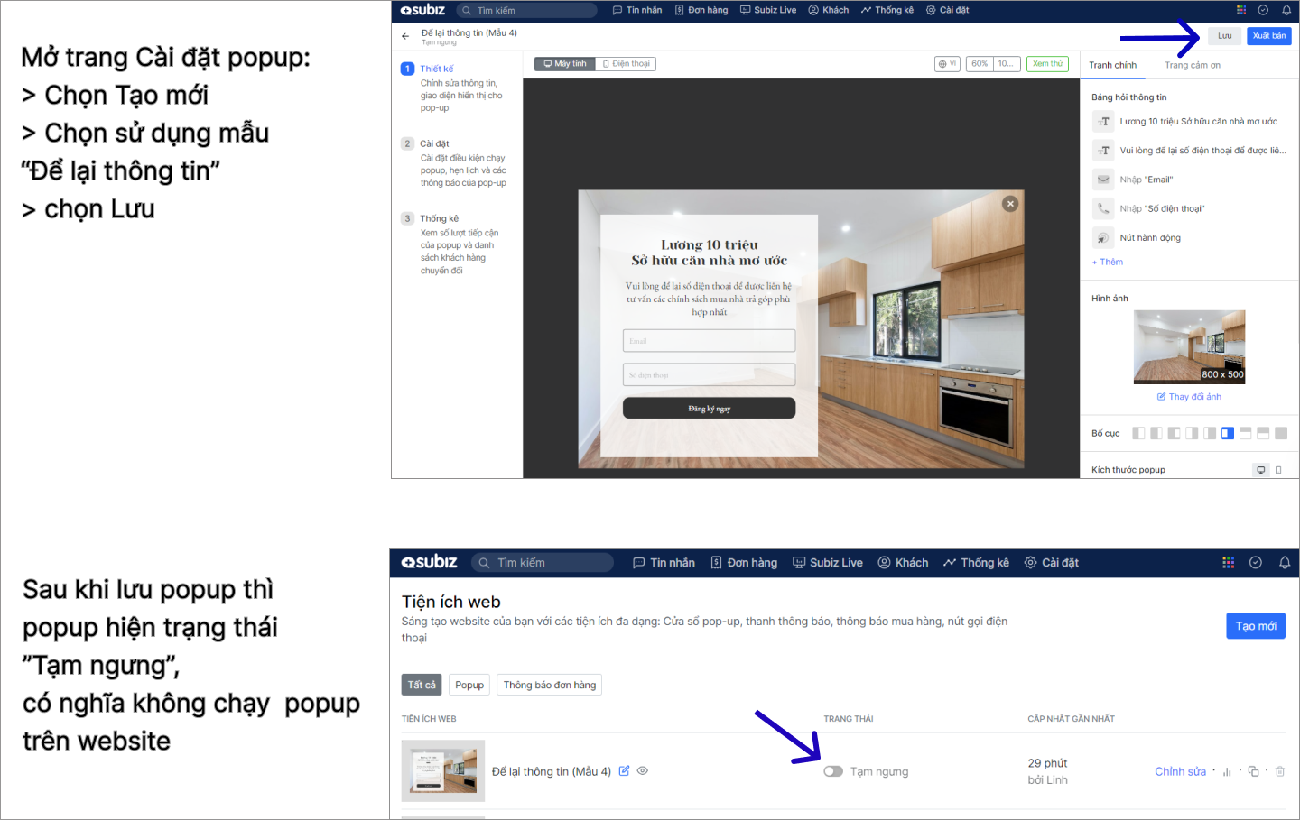 Khách điền thông tin qua bảng hỏi website sẽ được chuyển vào Subiz thông qua popup này. Vì vậy, bạn cần tạo popup để có mã định danh popup (ID popup) thêm vào API JavaScript tại bước 3.