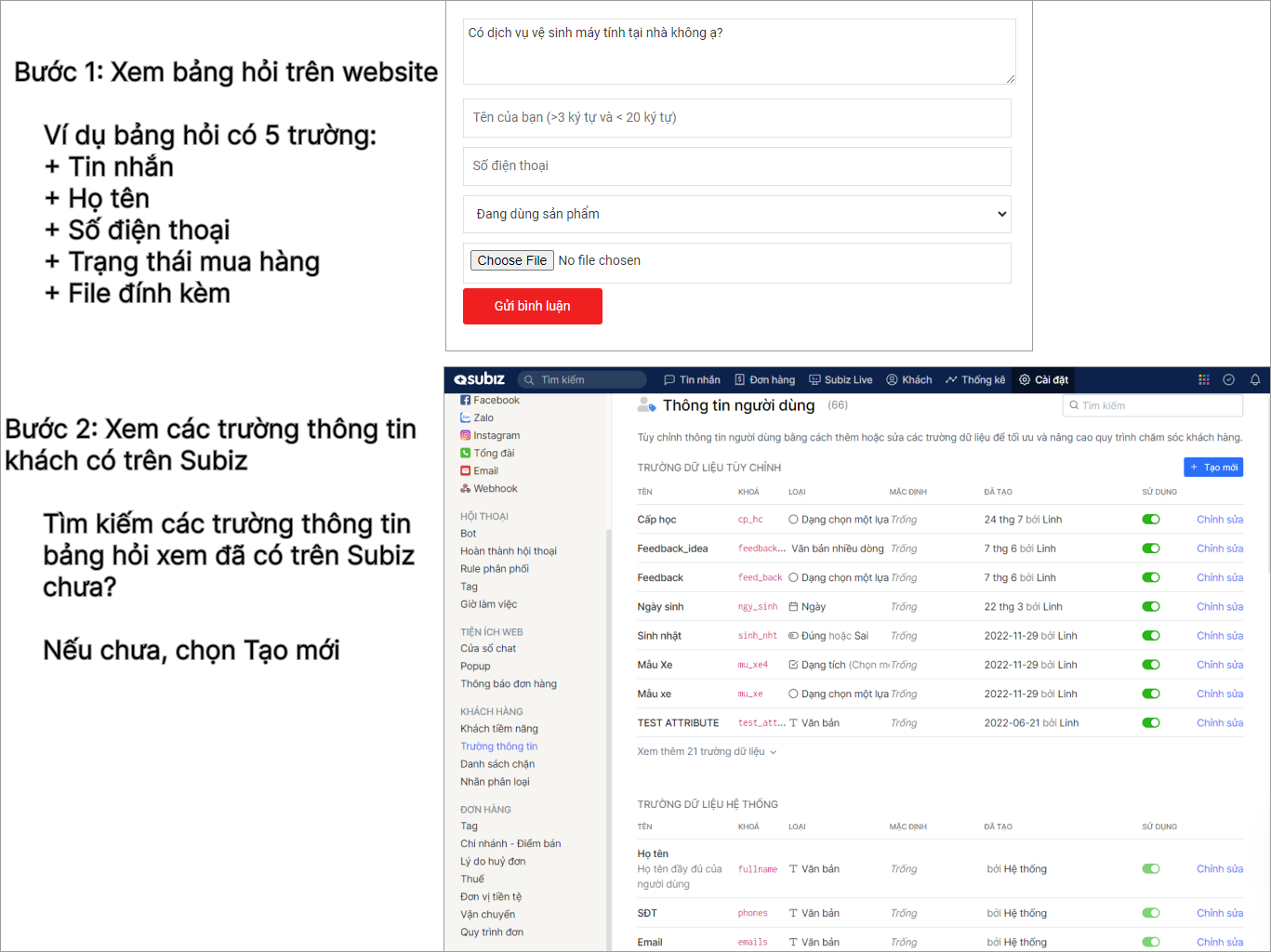 Để lưu các thông tin khách điền trong bảng hỏi trên website vào phần mềm Subiz thì phần mềm Subiz cần có các trường thông tin tương ứng.