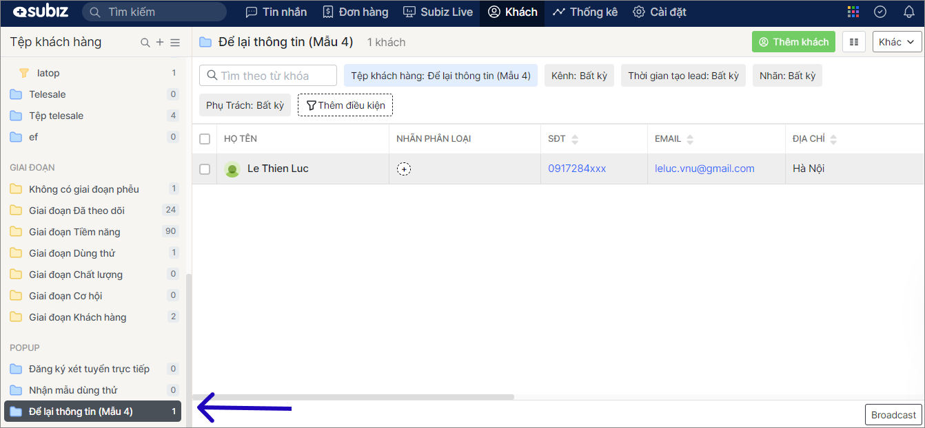Trả lời: Hoàn toàn làm được.Khách điền bảng hỏi thông tin được lưu và tổng hợp tại trang Khách. Bạn xem tệp khách hàng popup (Mở popup bạn đã tạo ở bước 2 như hướng dẫn bên trên) và chọn xuất file dữ liệu về.