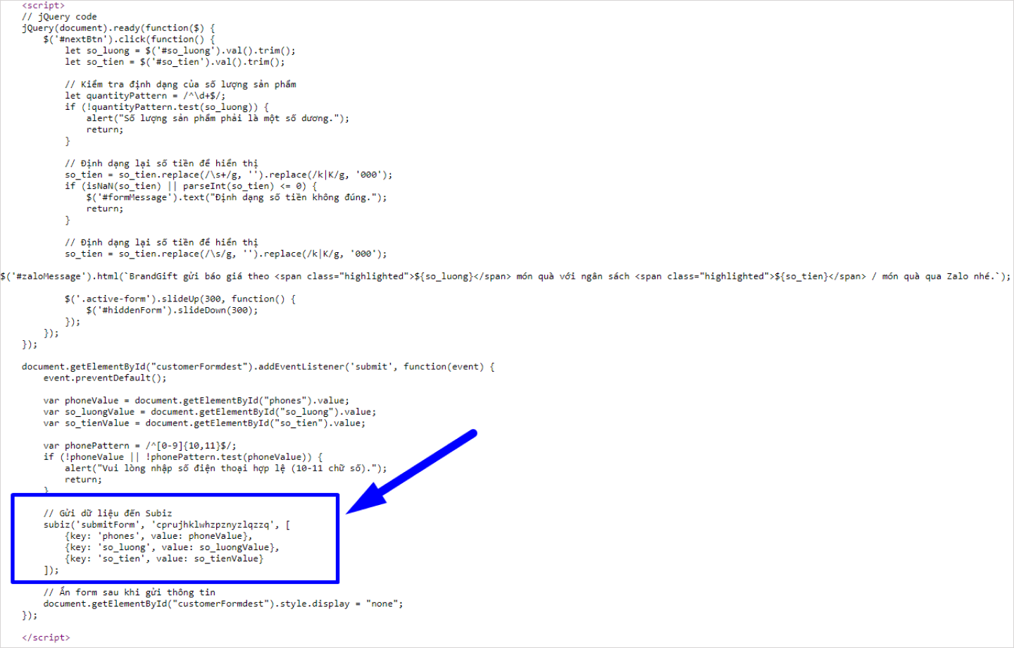 Bạn cần viết hàm API JavaScript để gửi dữ liệu từ bảng hỏi thông tin trên website đến Subiz sau khi khách hàng nhập xong thông tin.