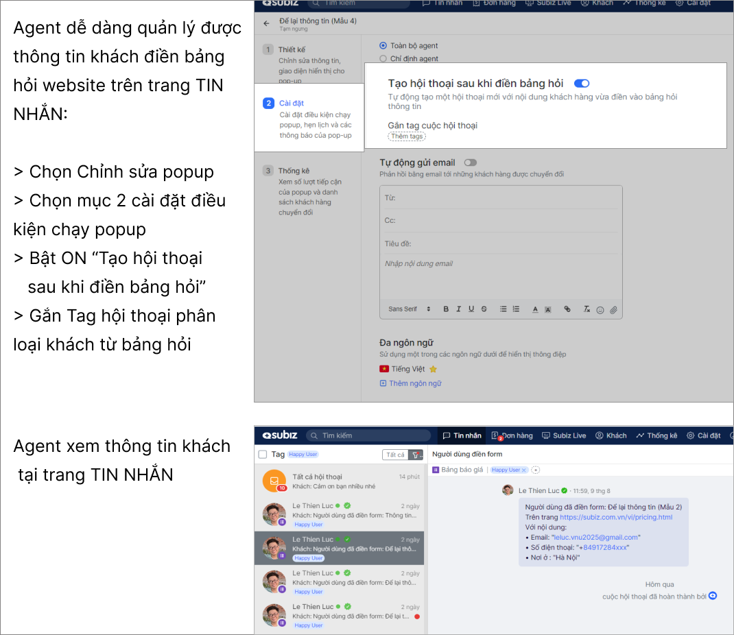 - Popup: Chức năng trên Subiz cho trung chuyển thông tin khách điền bảng hỏi vào Subiz.