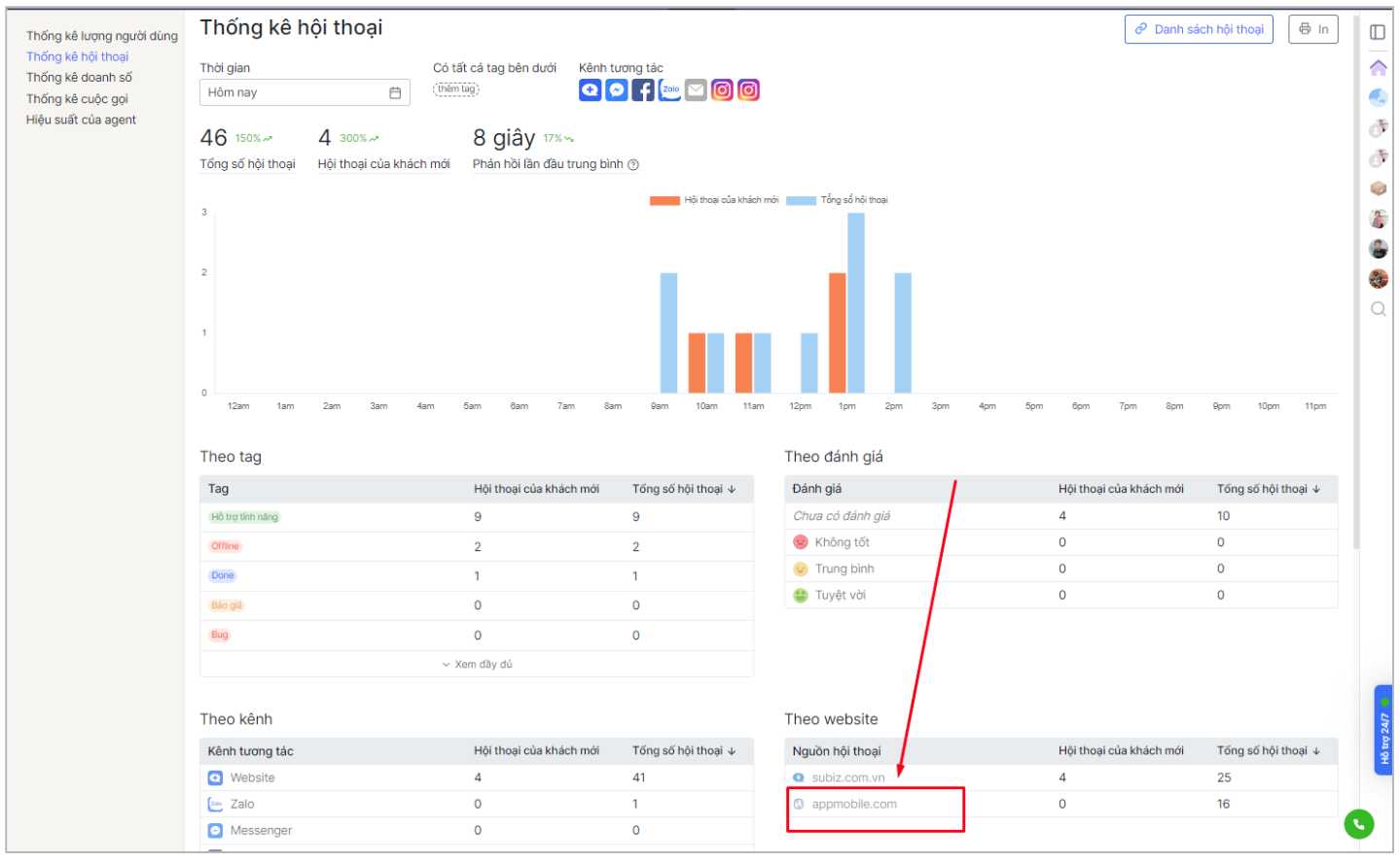 Hướng dẫn xemthống kê hội thoạitheo nguồn website, trong đó “appmobile.com” là url định danh cho nguồn app mobile.
