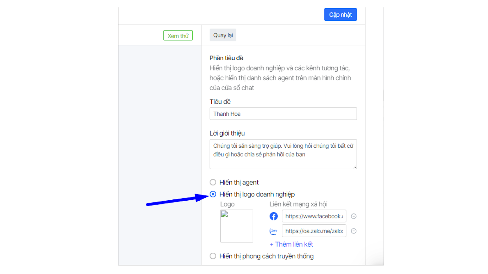 Cách hiển thị tên và ảnh logo Doanh nghiệp trên cửa sổ chat