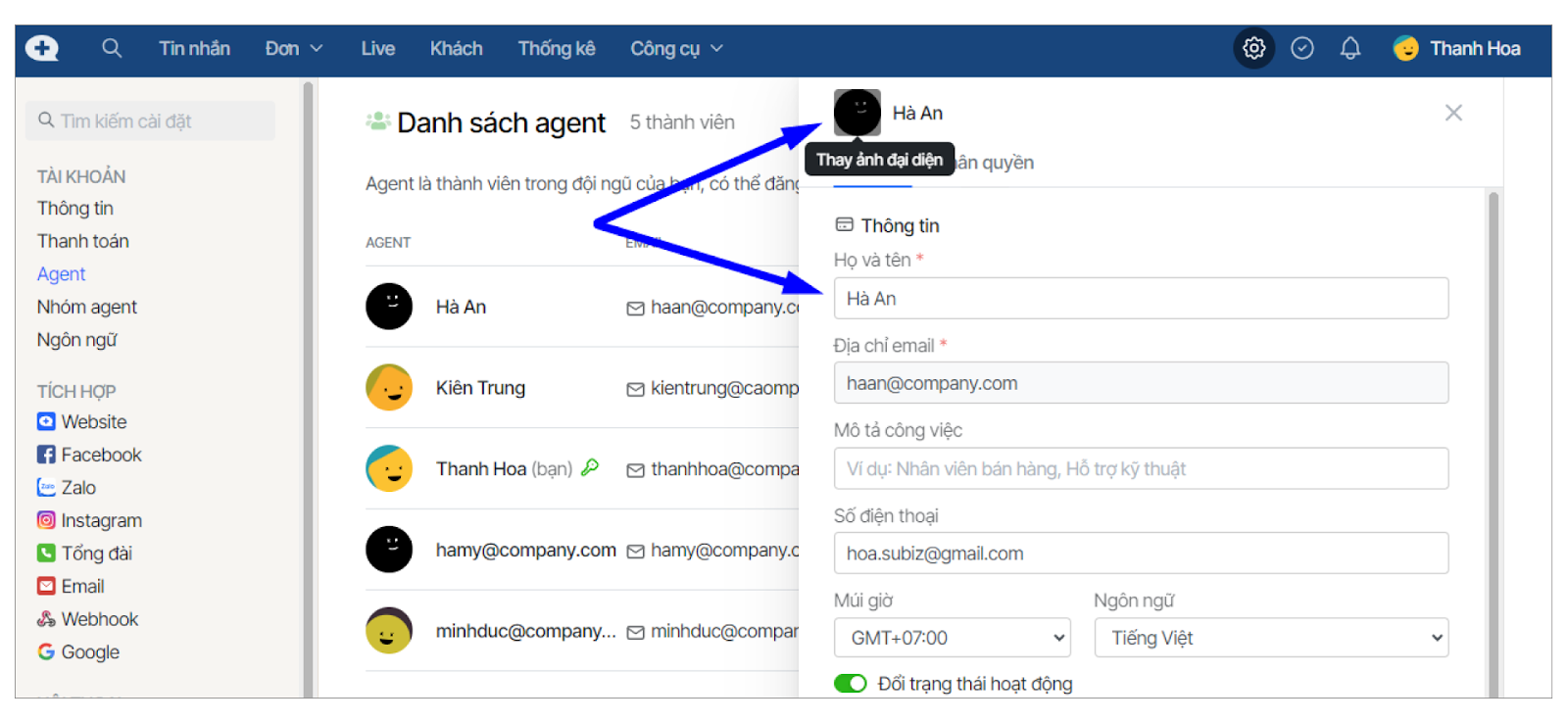 Bạn sẽ chỉnh sửa thông tin agent theo hướng dẫn sau: