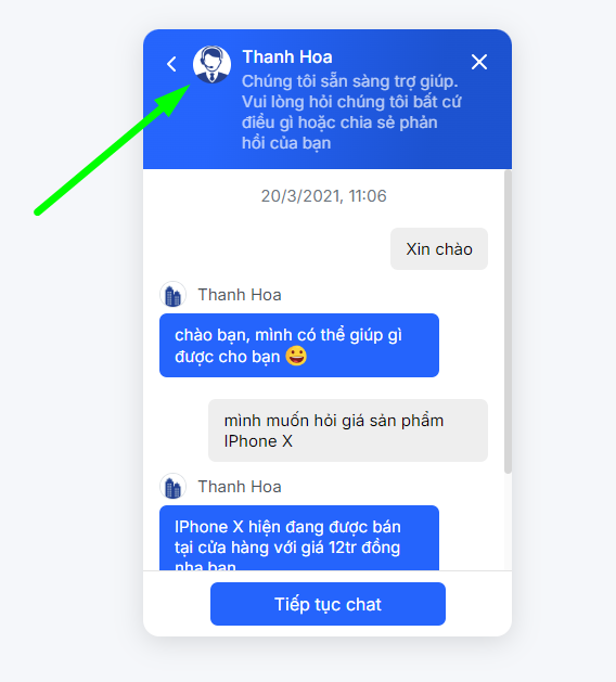 Bạn cần thay đổi ảnh và tên hiển thị trên cửa sổ chat. Đây là thông tin của agent.