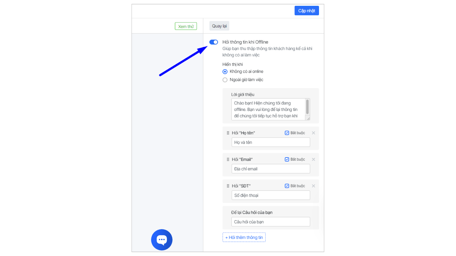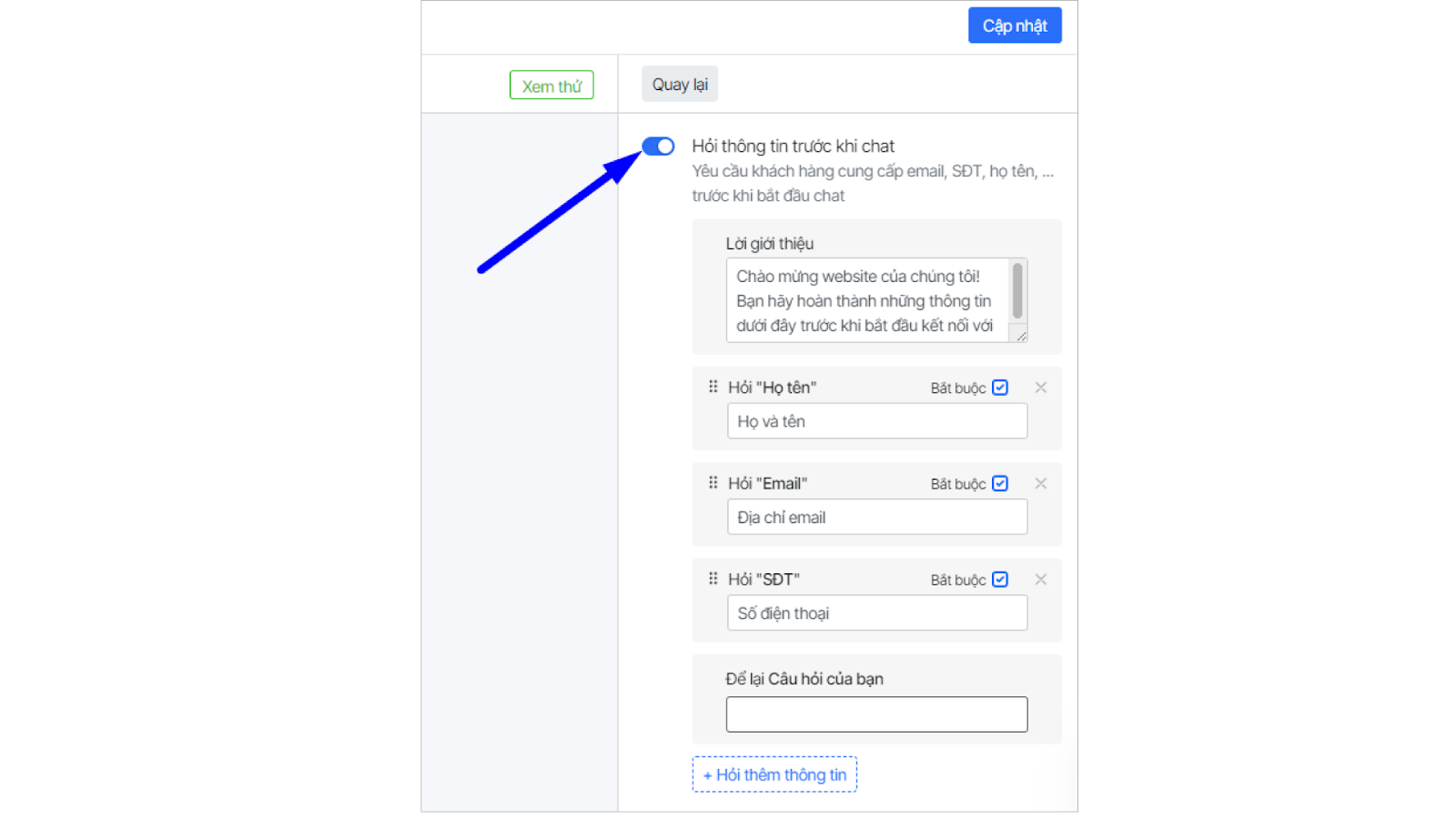 Cài đặt bắt buộc khách điền thông tin trước khi chat